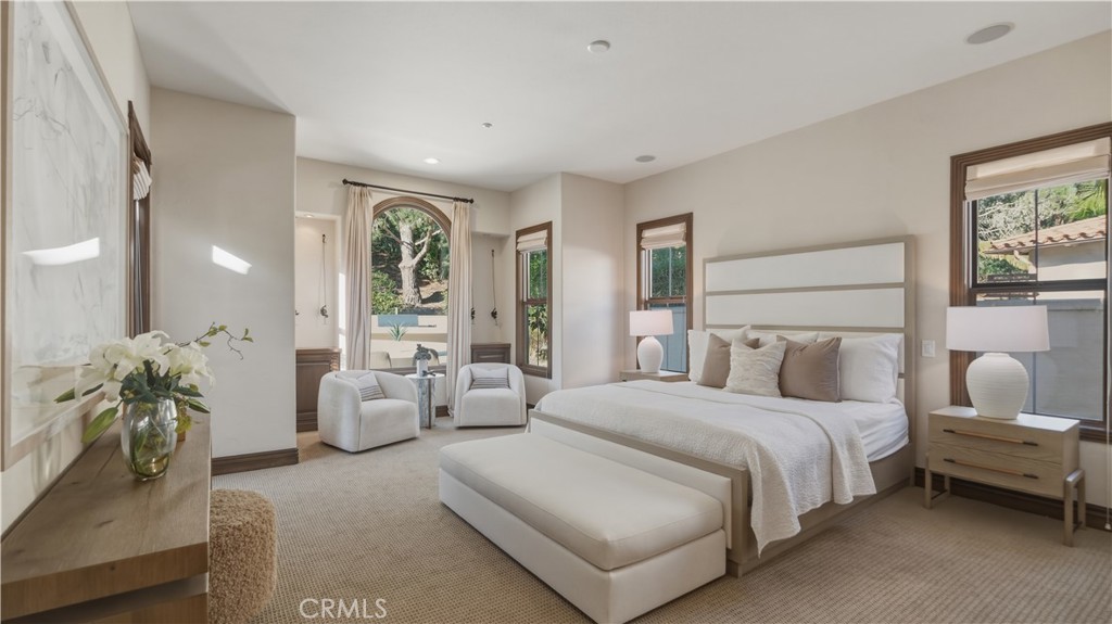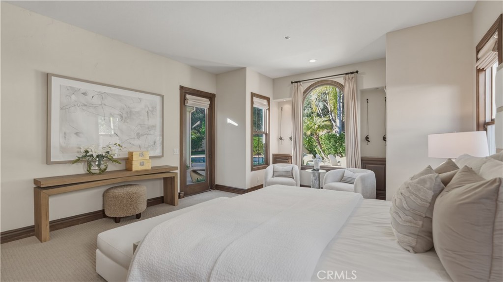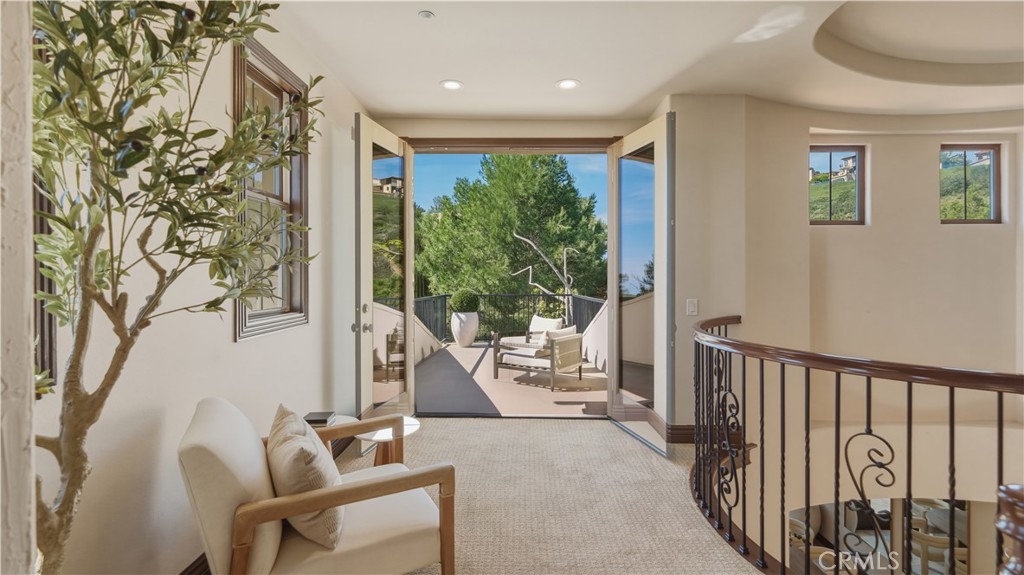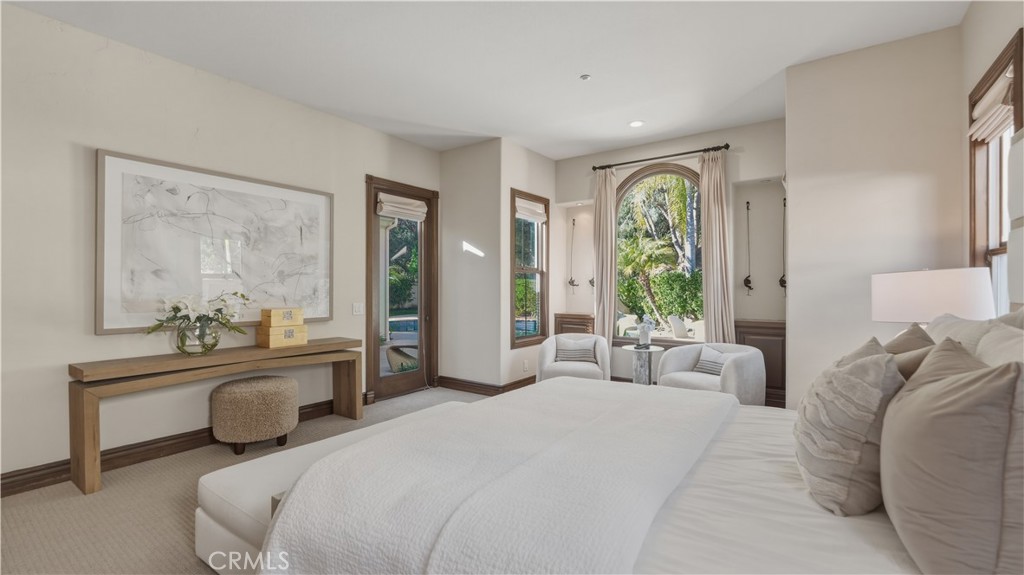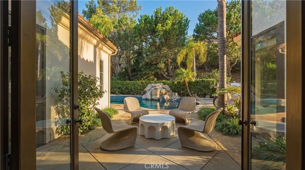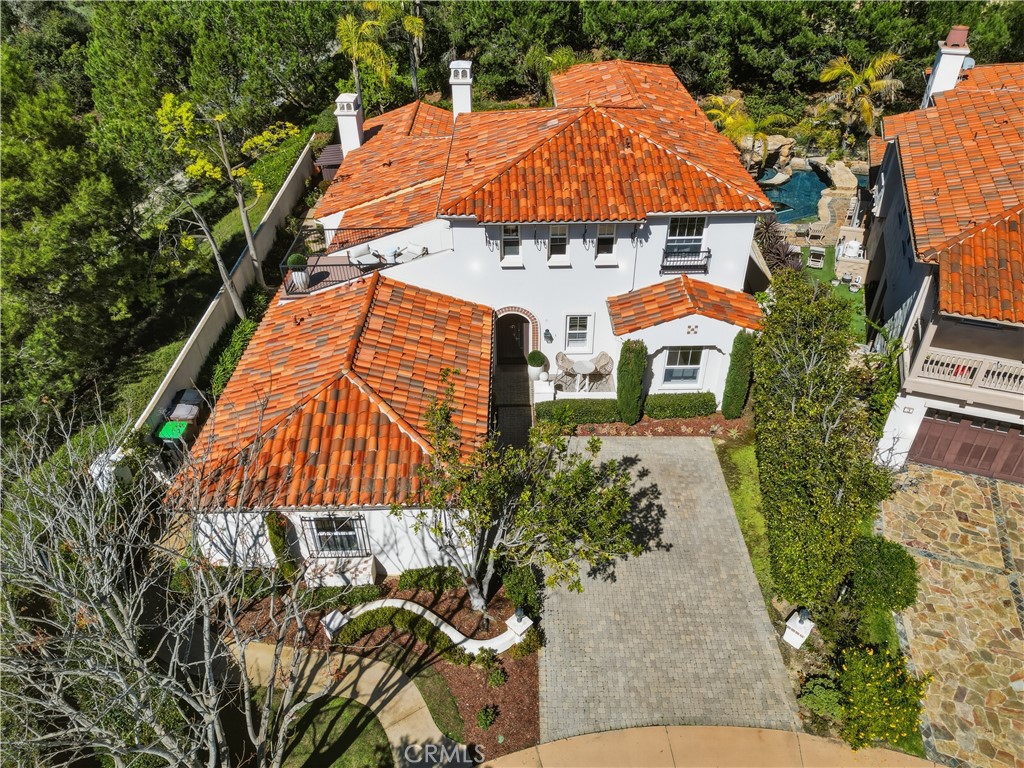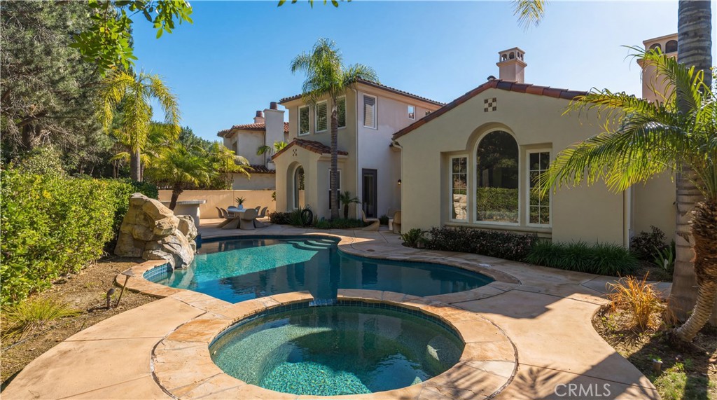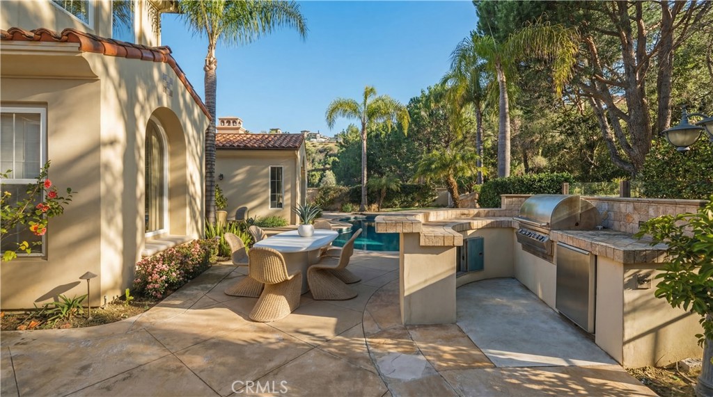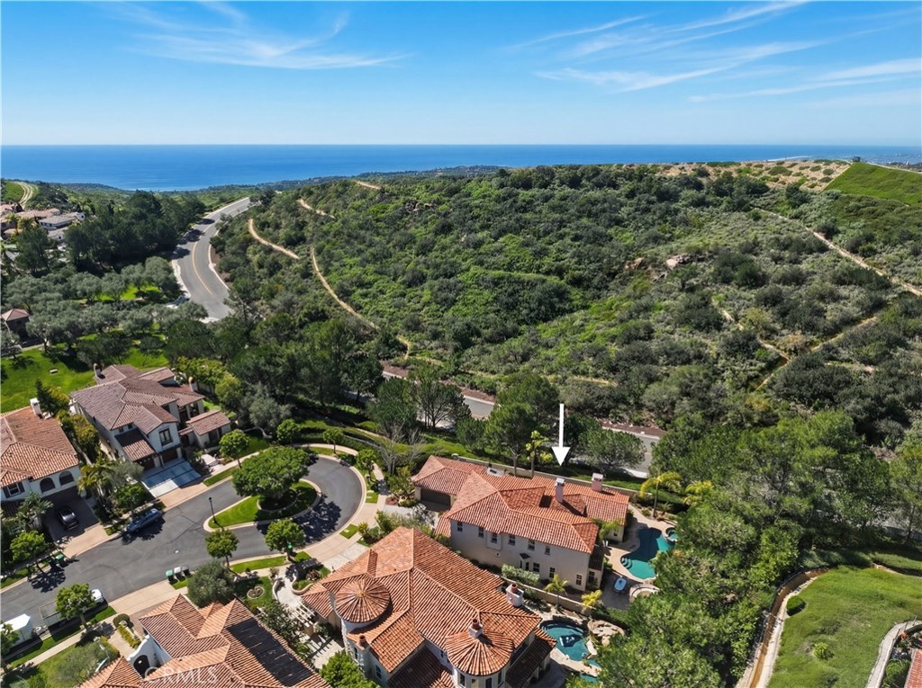 Set within the prestigious guard-gated Coastal Canyon enclave of Sausalito, this thoughtfully upgraded residence is ideally positioned at the end of a quiet cul-de-sac, offering enhanced privacy and a peaceful setting surrounded by open green spaces. The expansive, light-filled floor plan features four generously sized bedrooms, four full bathrooms, powder room, dedicated office, and a spacious bonus room. Designed for seamless indoor-outdoor living, the main living areas open to multiple entertaining patios, a custom built-in bar and barbecue area, and a private resort-style pool and spa--creating an inviting environment for both everyday living and gatherings. An upper-level deck provides tranquil ocean views and additional outdoor space to relax and unwind. Interior upgrades include travertine flooring throughout much of the main level, new carpet, custom crown moldings, extensive woodwork, and fresh interior paint throughout. The gourmet kitchen is appointed with Viking and Sub-Zero appliances, granite countertops, ample cabinetry, and opens directly to a spacious great room ideal for entertaining and casual living. The home is complete with a main-level primary suite and a secondary guest bedroom, offering exceptional convenience and flexibility for guests or multi-generational living. The property offers both tranquility and convenience, just moments from premier shopping, world-class dining, and Southern California's finest beaches.