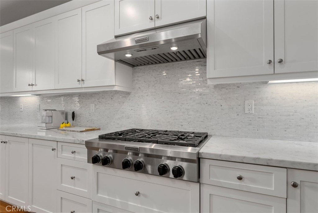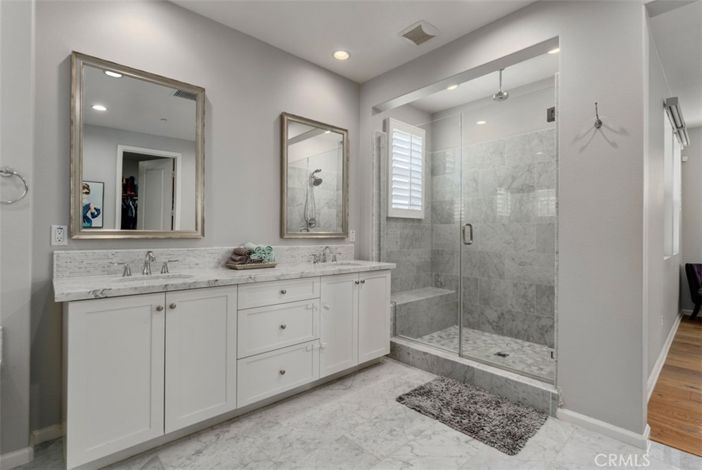 The home features 4 bedrooms, including a downstairs junior master suite with separate entry with its own AC, 4.5 baths, and a loft. The two-story foyer with light wood floors leads into the upgraded kitchen with white marble slab countertops, an oversized island, white marble tile backsplash, and upgraded stainless steel KitchenAid appliances. Upstairs, the master suite boasts hardwood floors throughout, and a fully upgraded marble master bath with marble floors, countertops, backsplash, full shower surround with rain shower, and a soaking tub.