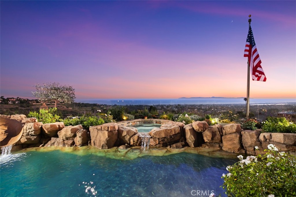 Available for the first time in nearly two decades, 25 San Mateo Way is one of the most iconic offerings in Corona del Mar's Spyglass Hill. Set on an extraordinary oversized lot with rare positioning, this trophy estate captures sweeping, unobstructed views that span Newport Coast's hillsides, Pelican Hill Golf Course, the Pacific Ocean, Catalina Island, Newport Harbor, Fashion Island, and sparkling city lights stretching to downtown LA. A private gated driveway leads to the residence, where approximately 7,109 sqft of interior living space is complemented by nearly 720 sqft of covered outdoor loggia space. Nearly every room in the home embraces the panoramic vistas and unparalleled privacy. The main level begins with a grand foyer and features a formal living room, wine room & tasting area, sunroom retreat, and an expansive great room that blends the family room, kitchen, and informal dining for 10+. Frameless glass bi-fold doors extend the interiors to the backyard sanctuary. A main-level ensuite bedroom offers comfort for guests. The upper level hosts 4 additional bedrooms, including an executive office with retreat and a large loft/media room. In total, the home offers 5 bedrooms plus office, bonus room, optional gym or private den, multiple living areas, and exceptional flexibility. Resort-like grounds create a setting designed for both entertainment and everyday enjoyment. Highlights include a pool with slide, spa, waterfalls, built-in BBQ island, crushed seashell bocce ball court, water features, and two covered loggia spaces: one designed for dining al fresco, the other for lounging with a fireplace and television. The meticulously maintained landscaping evokes the romance of Tuscany and offers multiple seating points to enjoy the endless views. With its gated entry, oversized driveway, 3-car garage, and unique setback that ensures unusual privacy, 25 San Mateo Way stands apart as a truly one-of-a-kind opportunity. Combining iconic views, timeless design, and a legacy lot, this estate represents the very best of coastal Orange County living - just a stone's throw from premier shopping and dining at Fashion Island and the CdM Village, five-star luxury resorts, award-winning schools, John Wayne Airport, and convenient freeway access.