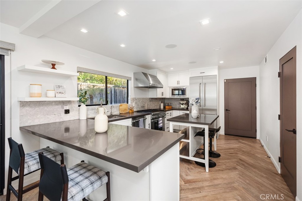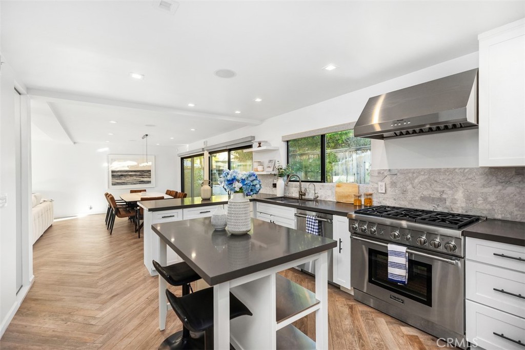 Welcome to 2870 Zell Drive, a beautifully detailed coastal retreat in Laguna Beach's highly desired Top of the World neighborhood. Positioned to capture ocean, Catalina, and sunset views, this home offers the perfect blend of relaxed comfort and timeless charm. The main level features an open-concept layout with chevron-patterned hardwood floors, a statement fireplace, and a floor-to-ceiling glass-enclosed wine display. The chef's kitchen includes Thermador stainless-steel appliances, a built-in refrigerator, walk-in pantry, and a center island, all opening to the dinning and family room plus a spacious front patio ideal for indoor-outdoor entertaining. Upstairs, the primary suite showcases ocean and sunset views, a private balcony, and a spa-inspired bath with a free-standing soaking tub and designer finishes. Two additional bedrooms and a full bath complete the second level, along with an expansive ocean-view deck featuring a built-in wet bar and generous lounge space for outdoor dining and enjoying coastal sunsets.