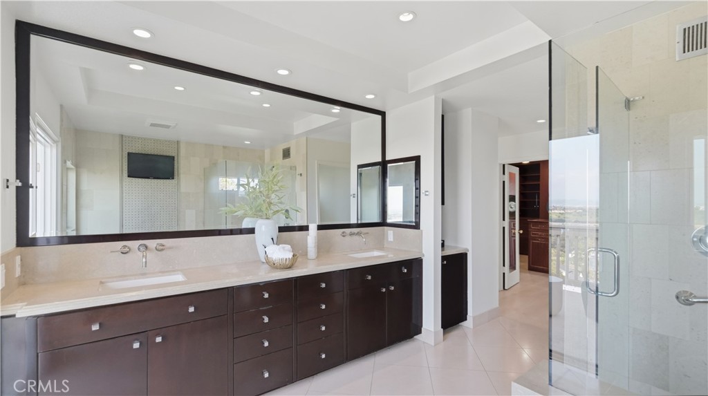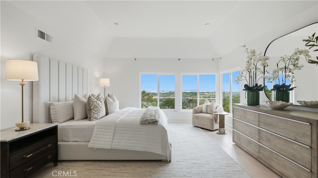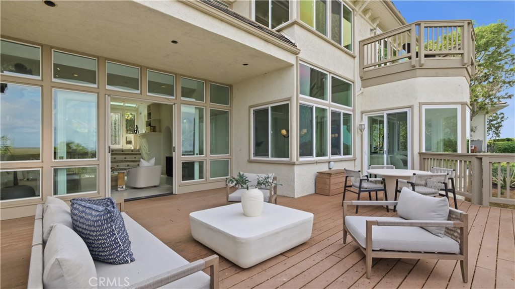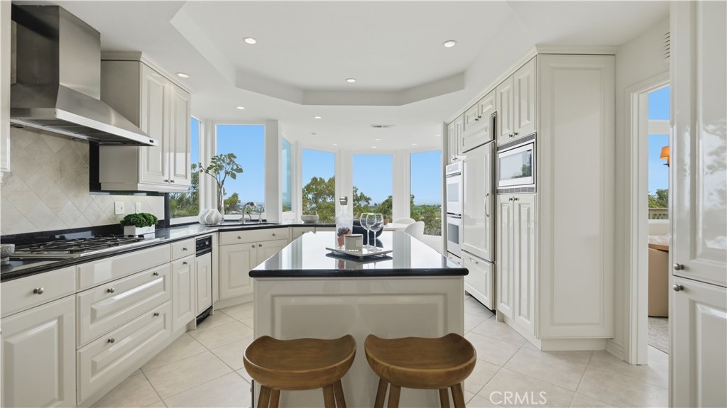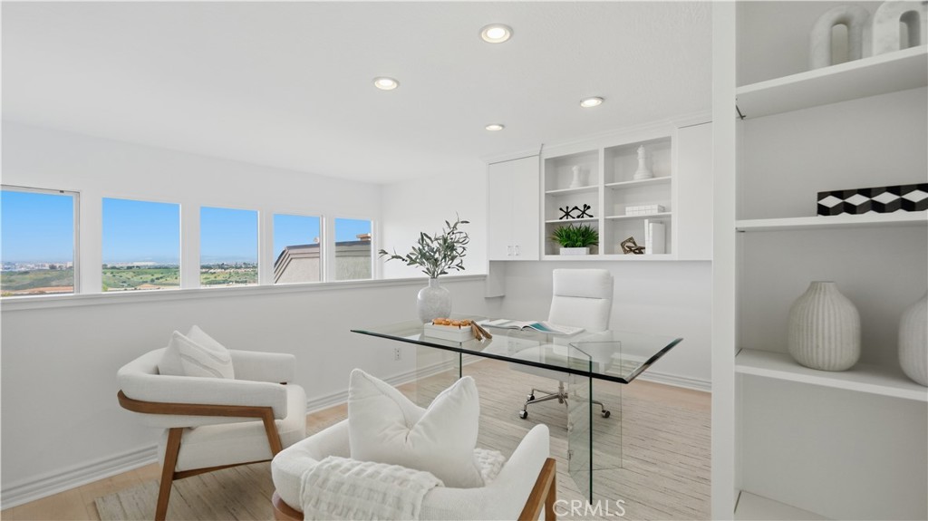Located within the gated enclave of Harbor Ridge, this 3 bedroom + office, 3 bath residence enjoys elevated city and ocean views, and a thoughtfully designed floor plan that balances privacy and functionality throughout the home. A gated entry leads to a landscaped courtyard, creating a quiet and welcoming arrival. Inside, the interiors are light filled and refreshed, featuring skylights, recessed lighting, and clean, neutral finishes. The main living areas are highlighted by high ceilings and seamless access to multiple outdoor patios, enhancing everyday living and entertaining. The kitchen is designed for both everyday living and entertaining, featuring a center island, black onyx granite countertops, high end appliances, generous storage, and a casual dining area overlooking the garden. A full bathroom is conveniently located on the main level, providing ease of access for guests and daily use. The upstairs office offers built in workspace and a quiet setting, making it well suited for working from home. The primary suite features two walk in closets, including a spacious cedar lined dressing closet, and a well appointed bathroom with dual vanities, a soaking tub, and a separate shower. The suite also opens to a private balcony, offering open views and a peaceful extension of the living space. Residents of Harbor Ridge Estates enjoy access to community pools, spas, tennis courts, and walking trails, all conveniently located near Fashion Island, Pelican Hill, Newport Beach's coastline, and award-winning schools.