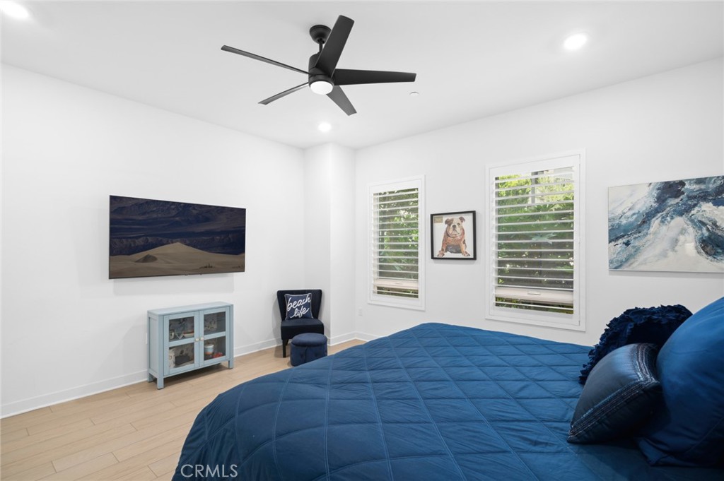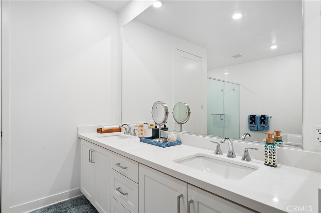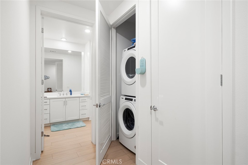The spacious primary suite features a spa-like en-suite bathroom with dual vanities, a walk-in shower, and a generous walk-in closet. The secondary bedroom also includes its own bathroom for ultimate privacy and flexibility. A separate powder room for guests and stackable laundry add everyday convenience.