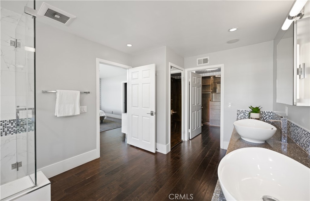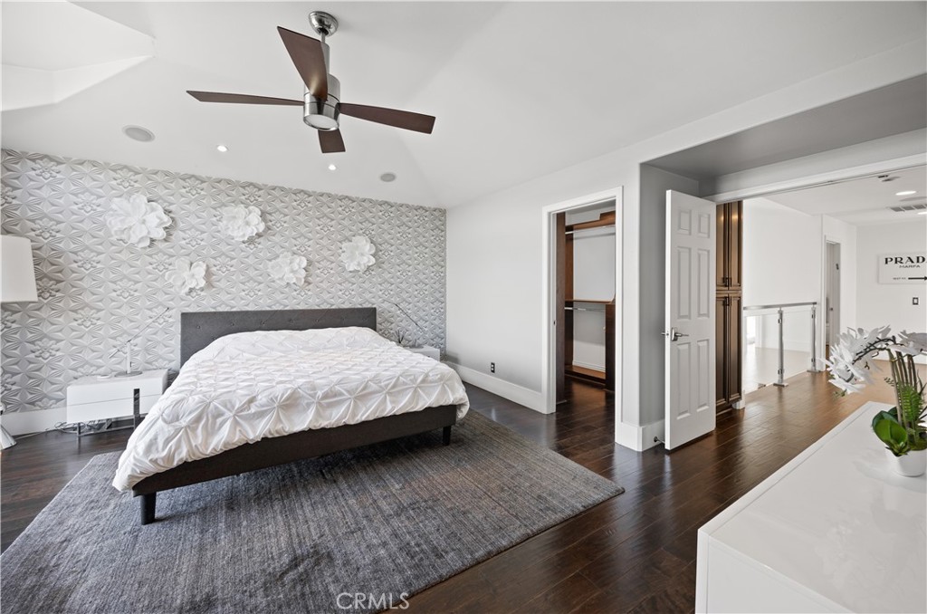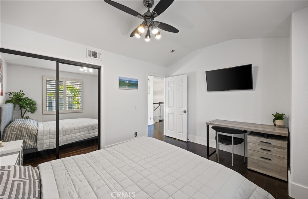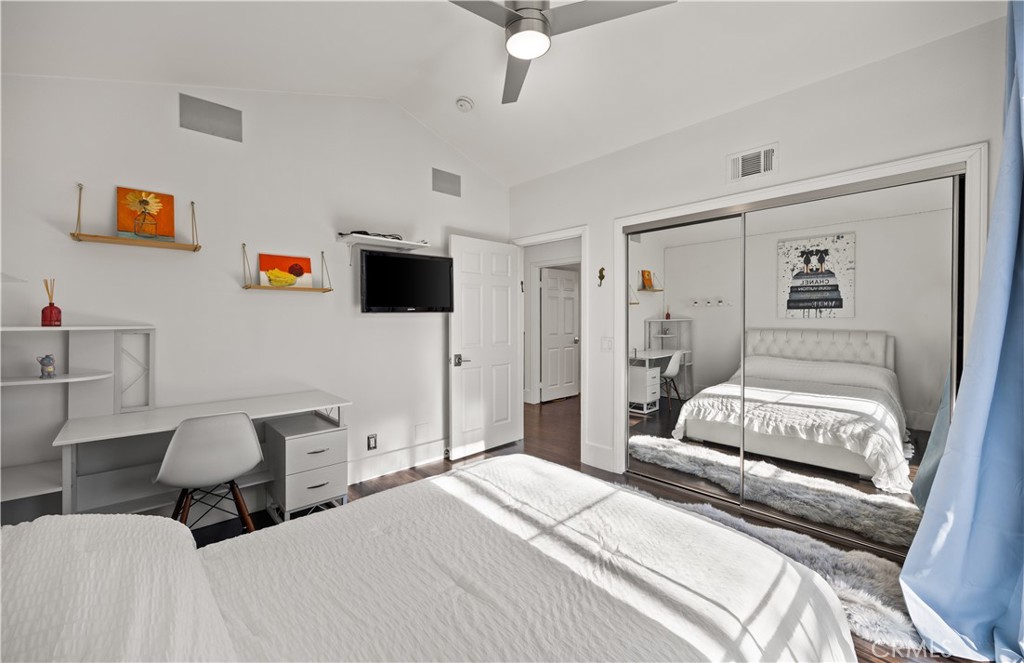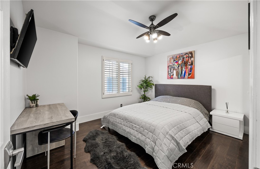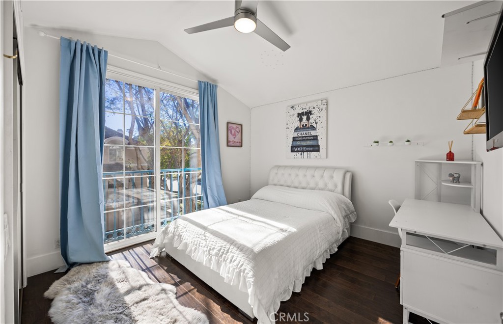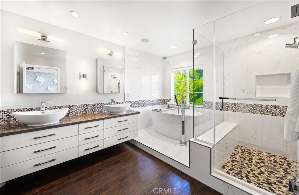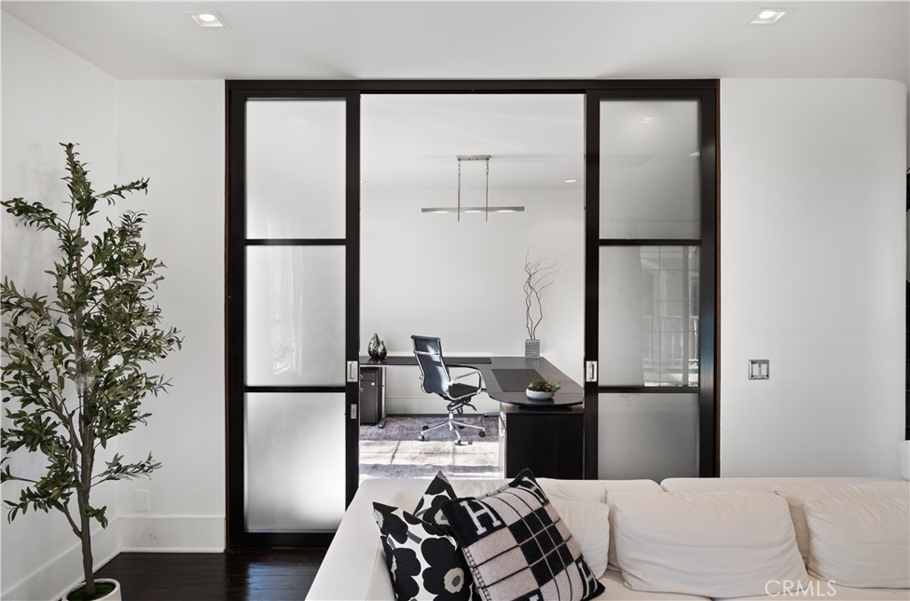 The kitchen and dining area flow seamlessly to a private rear-yard oasis framed by mature hedge trees for enhanced privacy, complete with a water feature, gas BBQ, and hot tub overlooking the canyon. Custom Bali privacy blinds in the kitchen and dining area allow natural light while maintaining privacy. A separate main-level office, divided by custom sliding glass doors, provides an ideal work-from-home setup.