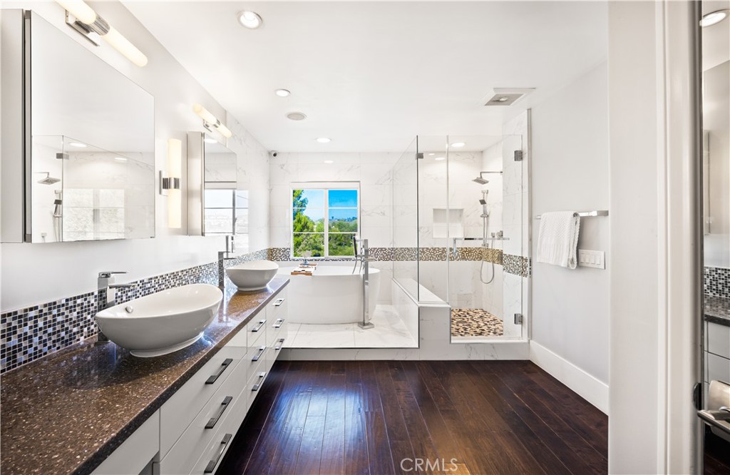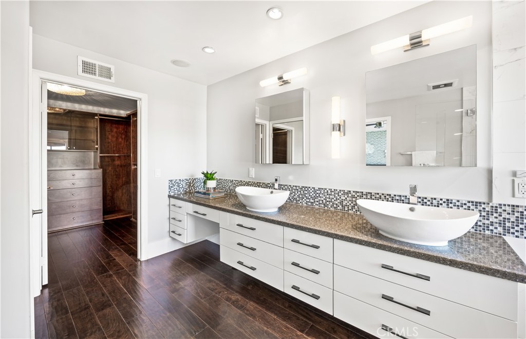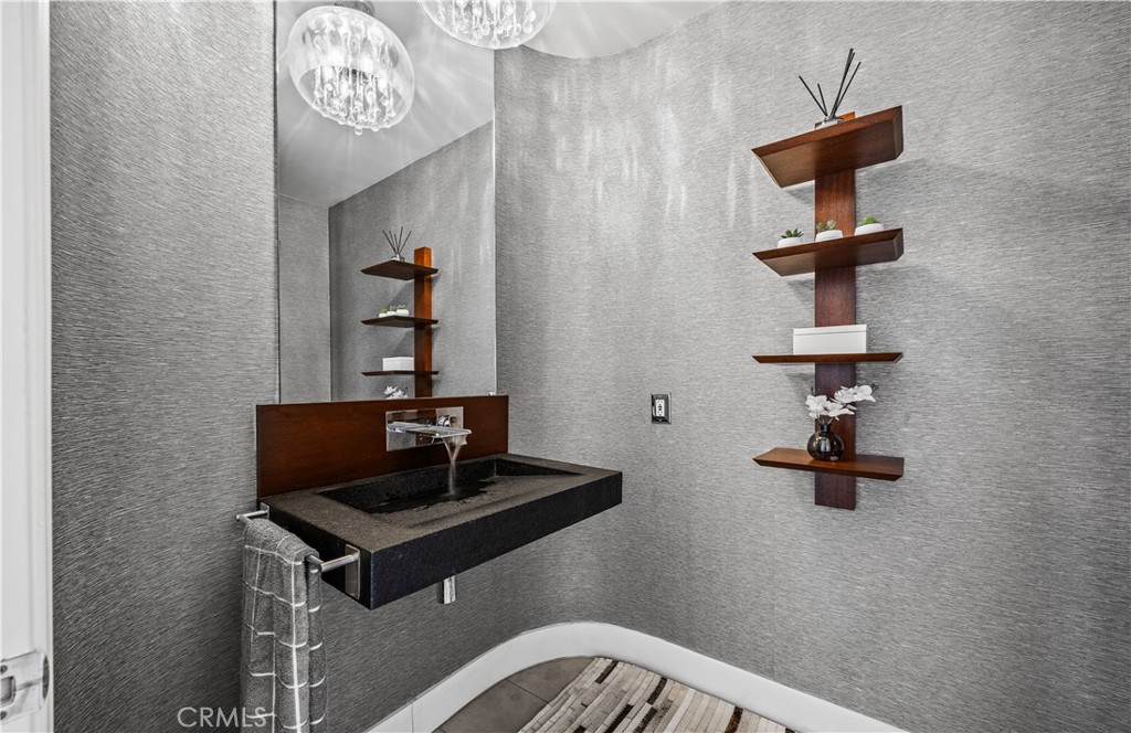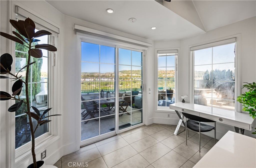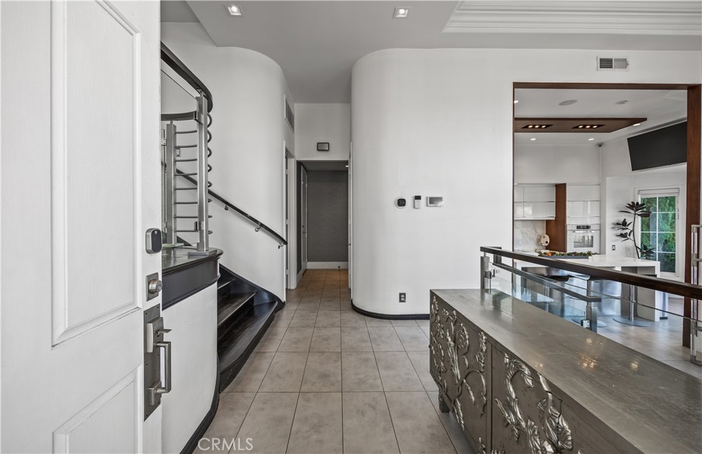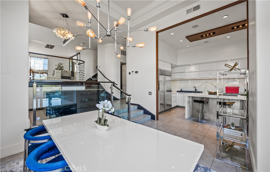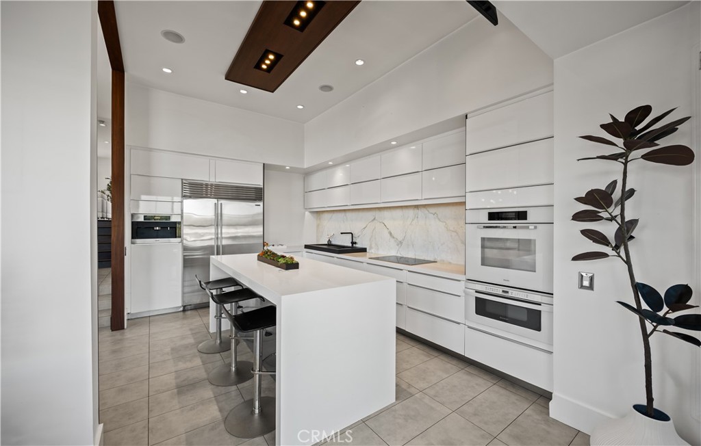 The exceptionally large, double-sized kitchen--a significant upgrade over the original half, L-shaped kitchens in the community--is a gourmet showpiece featuring 16-foot ceilings and tranquil canyon views. Designed for everyday living and entertaining, it offers high-gloss flat-front cabinetry, white marble countertops and backsplash, a built-in Miele espresso machine, Miele wall oven, Fisher & Paykel dishwashers, Sub-Zero refrigerator, and a Miele induction cooktop.