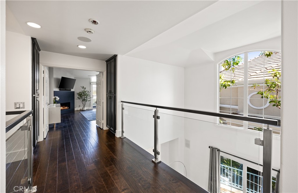 Upstairs, the primary retreat features a gas fireplace, private balcony with canyon views, dual closets, and Hunter Douglas custom motorized blinds with sheer and blackout options. The spa-like primary bath includes marble wall tile, soaking tub, walk-in shower, and dual-sink cabinetry with seated vanity. Two additional bedrooms and a full bath complete the floor plan.