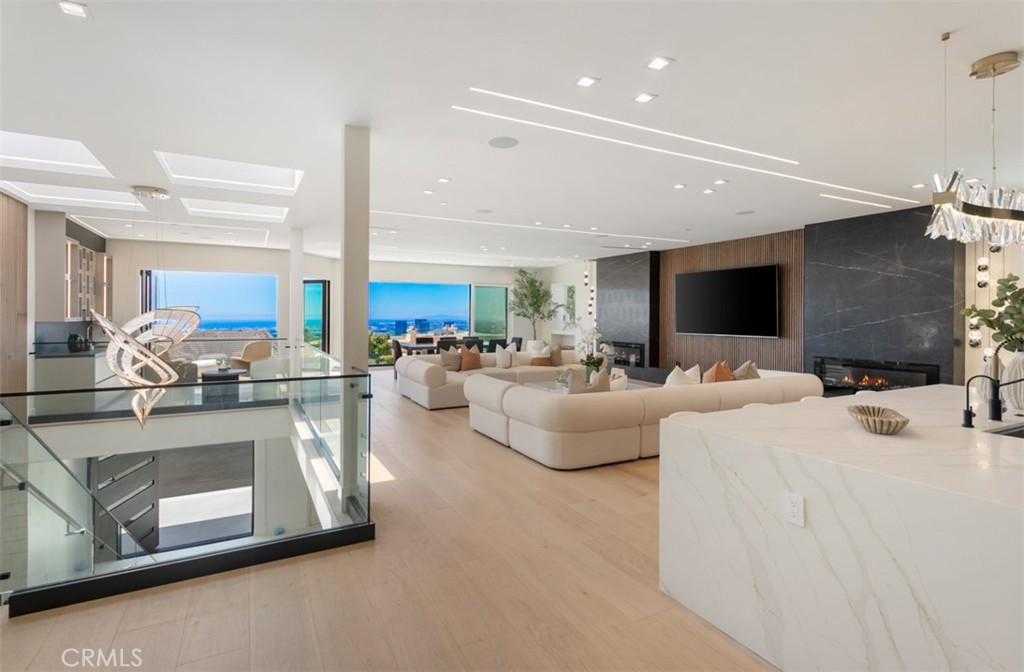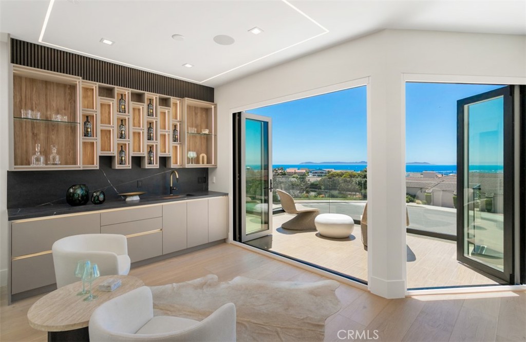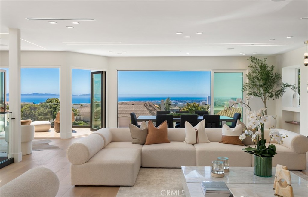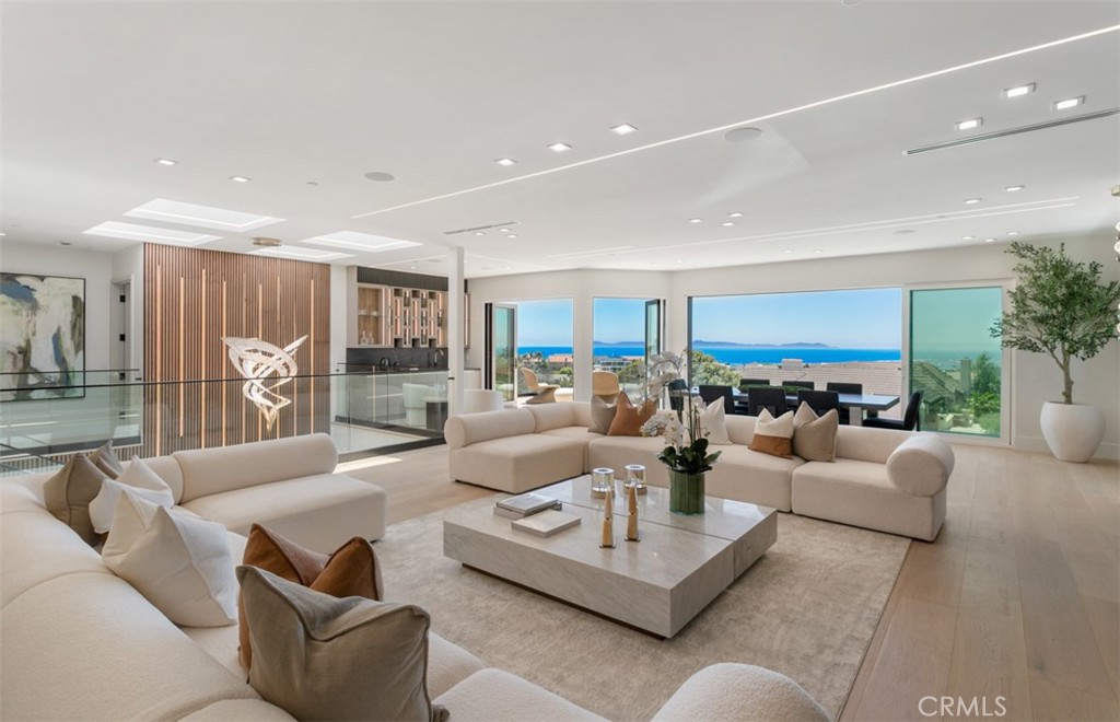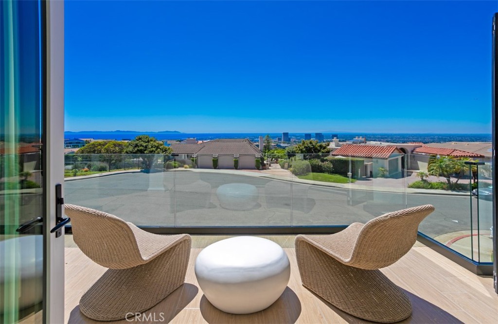 Perched at the end of a quiet cul-de-sac within the exclusive guard-gated enclave of Harbor Ridge, 4 Narbonne is a stunning showcase of design, function, and luxury. Completely reimagined, this architectural gem blends striking modern aesthetics with a warm, inviting ambiance--perfectly tailored for entertaining and everyday living. Beyond a private entry gate and custom oversized front door, you're welcomed into a dramatic open-concept layout filled with natural light, curated finishes, and an effortless indoor-outdoor flow. The main level offers three spacious bedrooms, including a junior primary suite with ocean views, and two secondary bedrooms that overlook a serene water feature. A sleek lounge with a fireplace, bar, and media wall adds to the home's entertainer appeal. Take the elevator upstairs, where panoramic views span the Pacific Ocean, Catalina Island, Newport Harbor, and city lights that stretch to downtown LA. Designed for both grandeur and comfort, this level features two additional bedrooms--one currently used as a home office with its own balcony--as well as a show-stopping primary suite wrapped in floor-to-ceiling glass. The spa-like bathroom and boutique-style closet complete the experience. The heart of the home includes both a front-facing designer kitchen and a full secondary prep kitchen, flanked by a breakfast nook, formal dining area, double fireplaces, and walls of sliding and bi-folding doors that dissolve the line between indoors and out. Step into your own private resort: a spectacular outdoor oasis with a pool, spa, dry sauna, multiple waterfalls, a BBQ island, fire table, and ample lounge and dining areas--designed to impress and built to entertain. With every box checked--guard-gated security, panoramic views, stunning finishes, and true turnkey luxury--this is coastal living at its finest.
