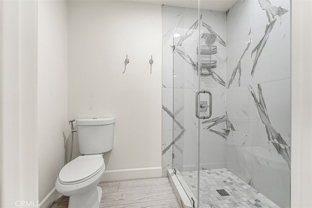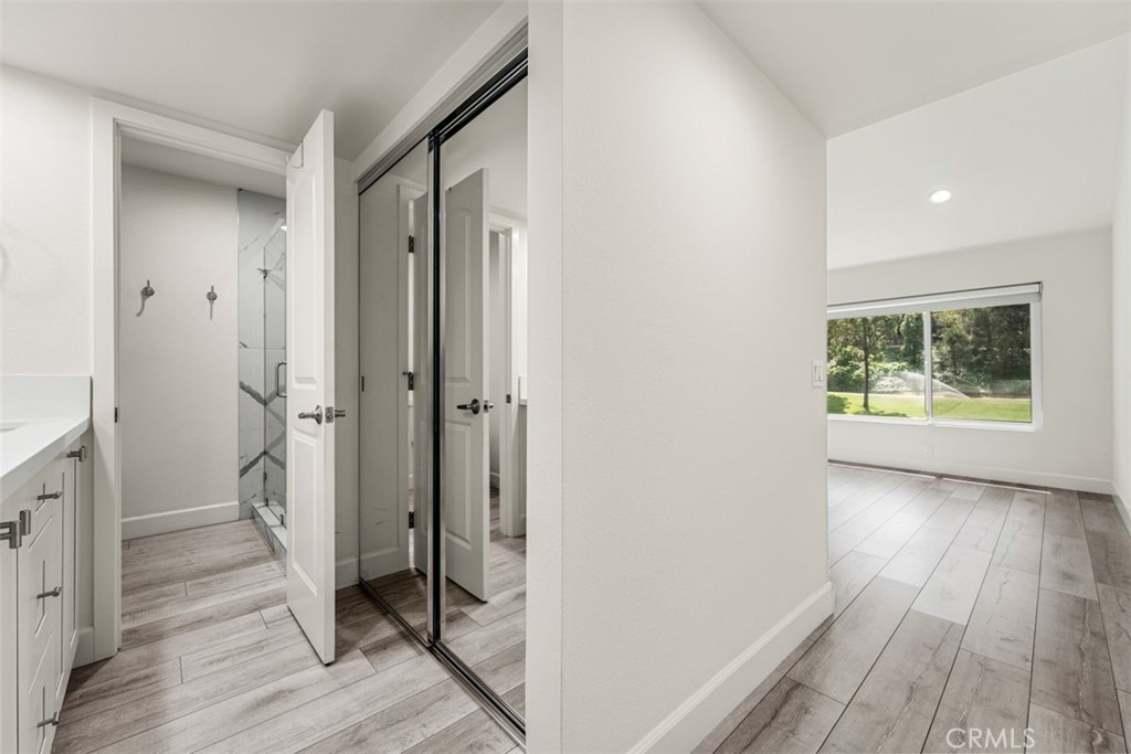 The spacious primary suite offers vaulted ceilings, a wall-to-wall mirrored closet with built-in organization, and a well-appointed en-suite bath featuring dual vanities and a floor-to-ceiling tiled walk-in shower. A generously sized secondary bedroom and full bath complete the interior.