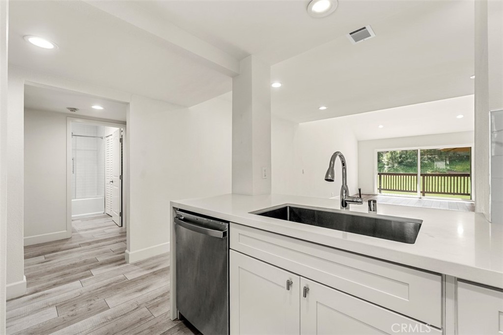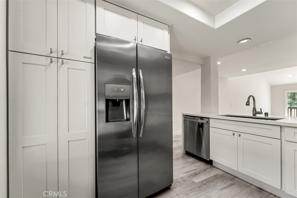 The kitchen has been tastefully remodeled with white shaker cabinetry, quartz countertops, stainless steel appliances, a single-basin sink, and newly added custom pull-out drawers for enhanced functionality. It opens effortlessly to the dining area, complete with breakfast bar seating.