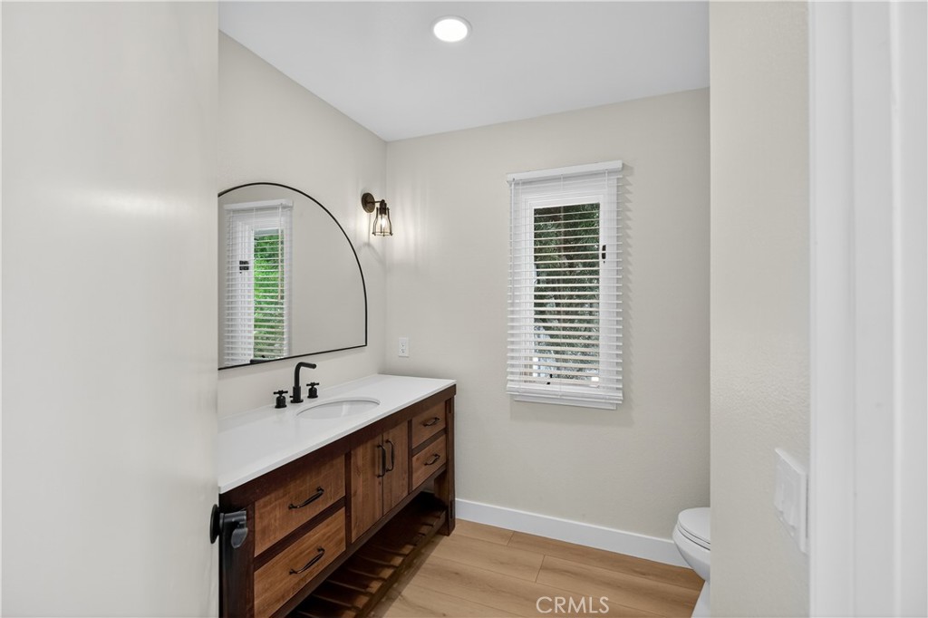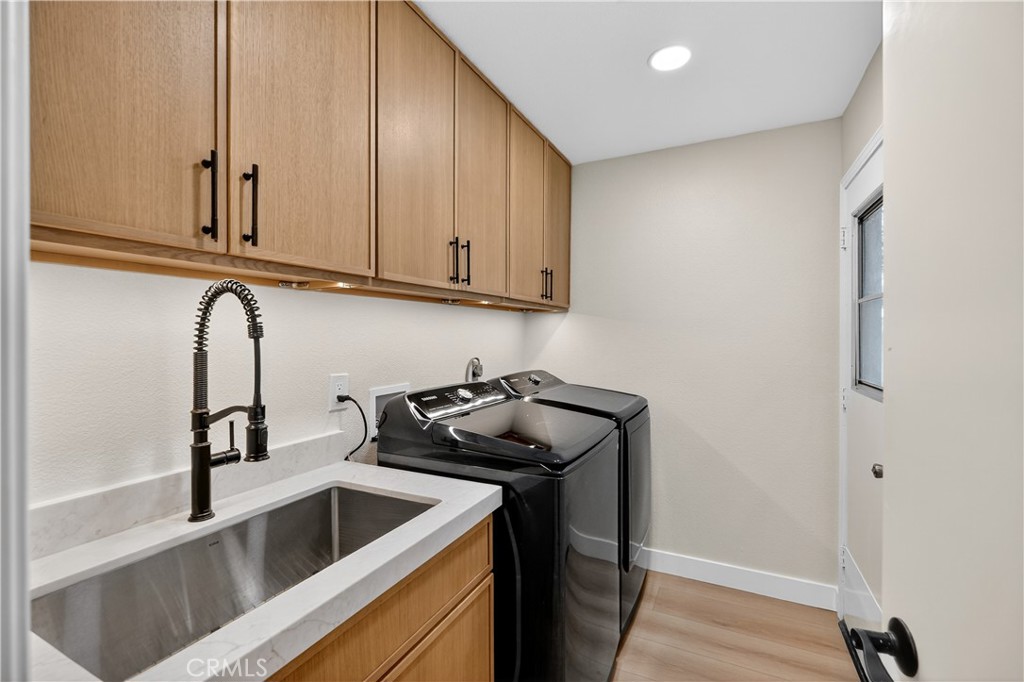 The luxurious primary suite includes a soaking tub, walk-in shower, dual sinks, and designer fixtures. All bathrooms are fully remodeled with premium finishes, including Kingston sinks and fixtures, new vanities, and modern tile. Additional upgrades include a brand new HVAC system, Samsung washer/dryer, custom laundry cabinetry with oversized utility sink, new interior door hardware, and a rebuilt entry deck.